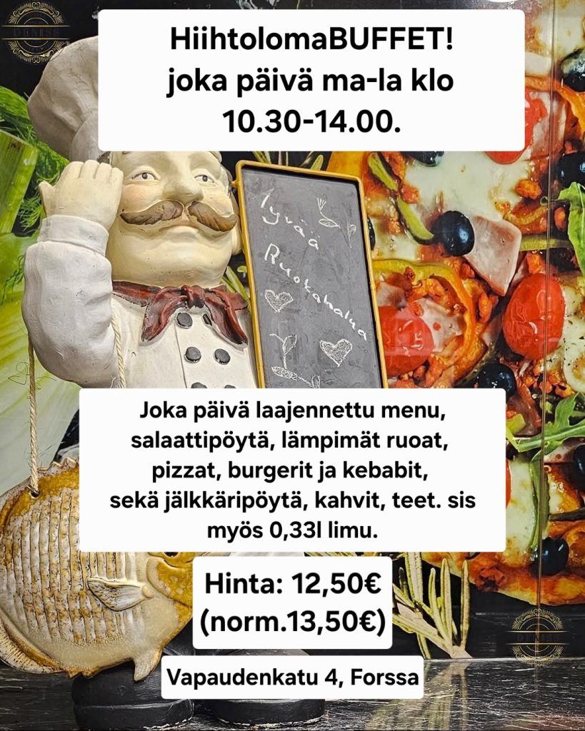 Arkisin klo 10:30 - 14:00 pizzoihin, kebabeihin ja salaatteihin sis. 0,33 l juoma.